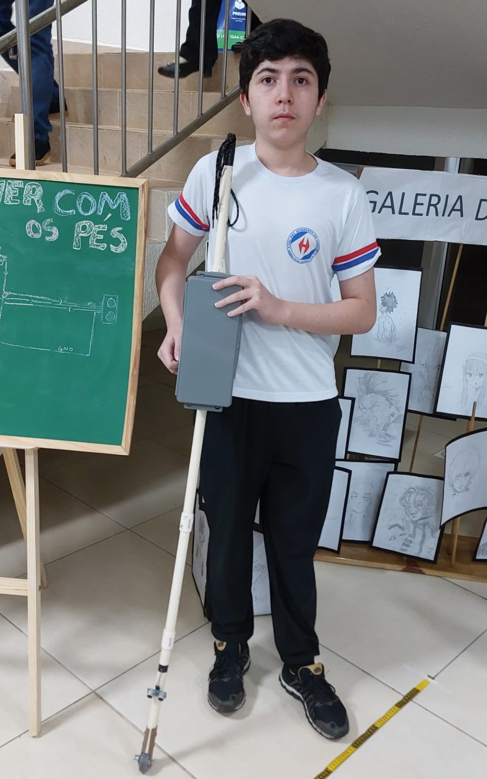 O filho de Gislaine, que além de altas habilidades, também é uma criança autista, nível 1 de suporte, e desenvolveu a bengala com sensor para cegos, nunca fez nenhum curso de eletrônica ou nada semelhante. Apenas a professora sugeriu se ele daria conta de fazer, e ele falou que daria, e fez.