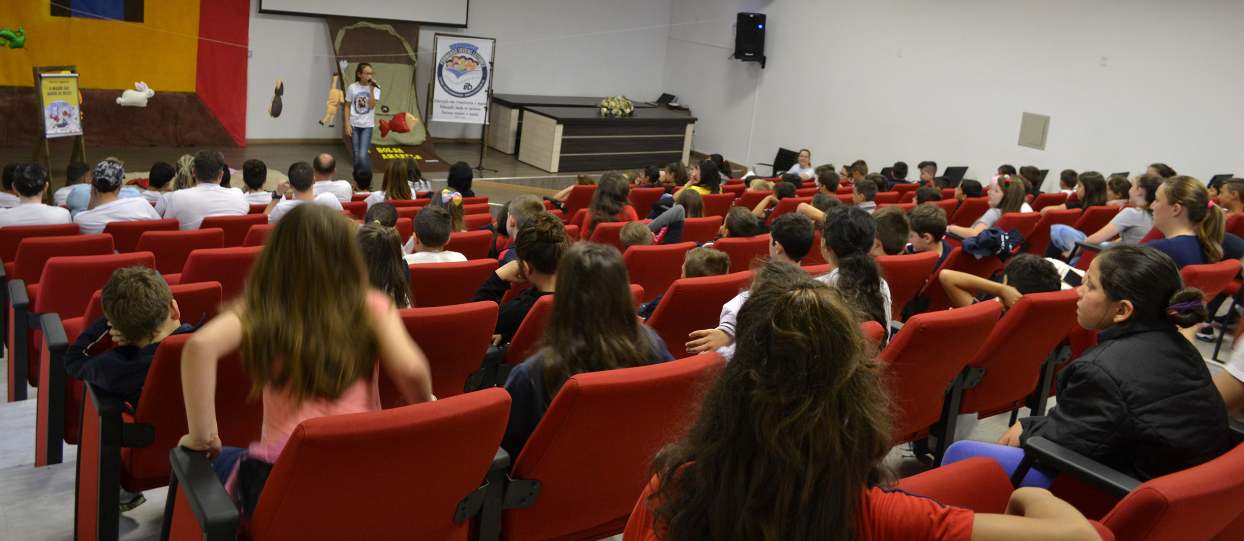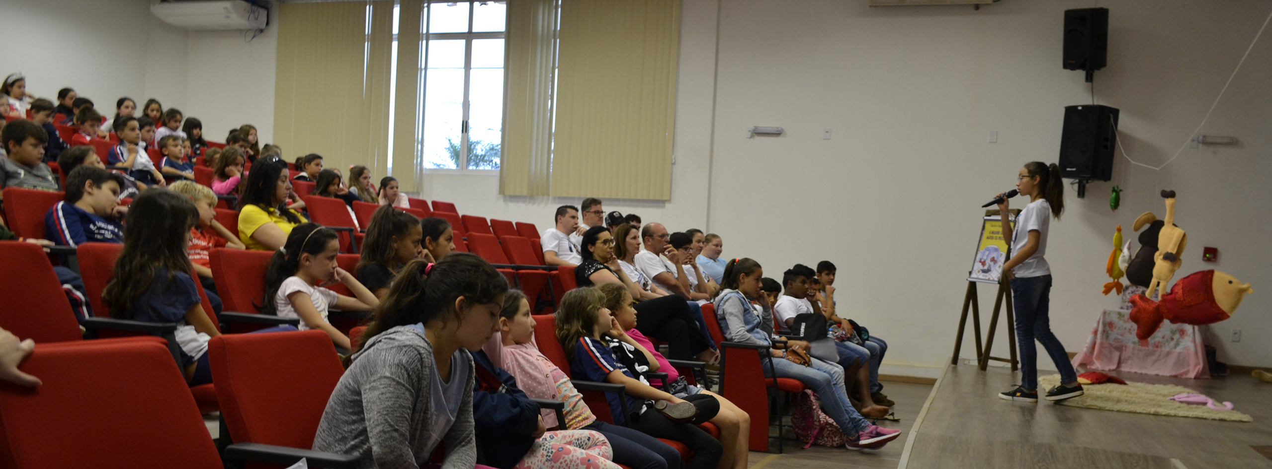 A aluna, Claudete de Almeida Zanardi, de 11 anos de idade, que frequenta o 6° ano 1 do colégio, apresentou o monólogo “A Mulher que Matou os Peixes”, de Clarice Lispector.